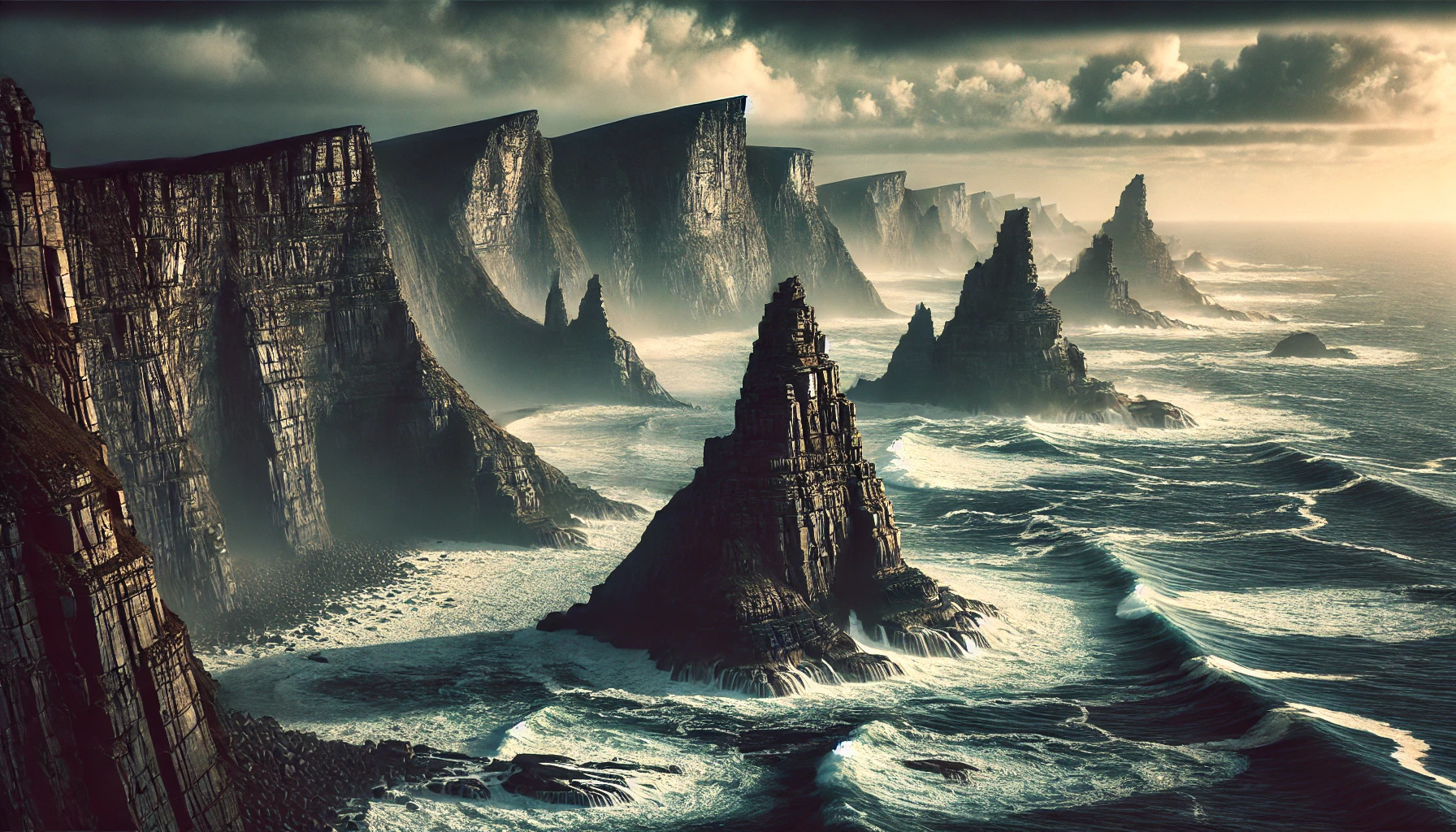 On the North-Eastern edge of Siar’Morrin is the Aegir Coast, a rugged and breathtaking region, known for its dramatic cliffs and the relentless pounding of the ocean waves. The Aegir Coast is a place of raw power and untamed beauty. Here, the sea carves the land with both fury and artistry, shaping a coastline that is both a challenge and a spectacle. Despite the harsh and unforgiving nature of the coastline, several cities have taken root along its shores, their inhabitants creating a life amidst the tumult of the ocean, relying on the bounty of the sea for sustenance and trade.