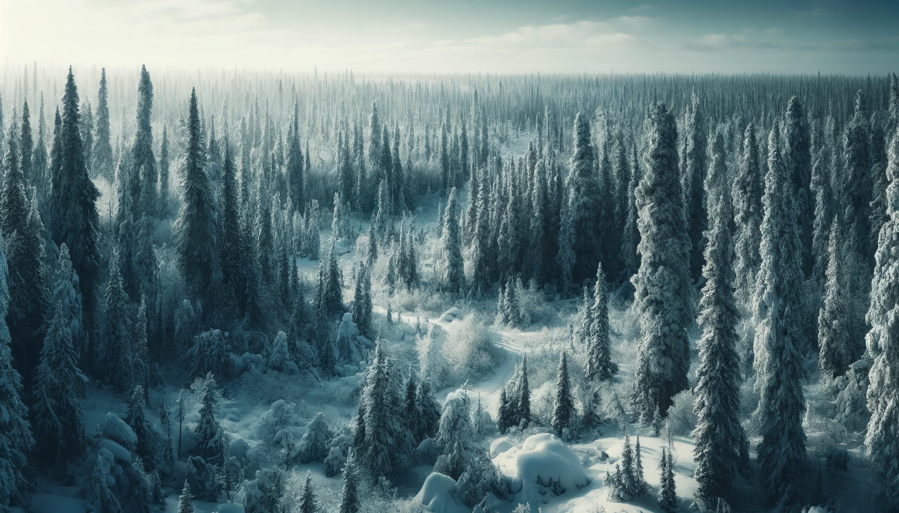 The forest spans a vast area characterized by long, dark winters that cloak the land in snow and ice, creating a landscape that seems frozen in time. With the arrival of spring and summer, the forest bursts into life, showcasing a stark contrast between the cold desolation of winter and the vibrant fertility of the warmer months. The severe conditions and remote location contribute to its untouched and wild nature.