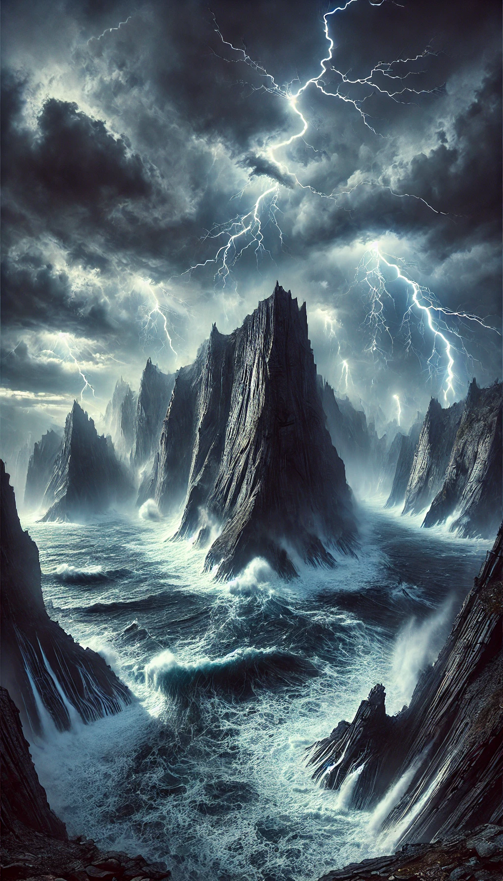 Poraal’s Bluff features dramatic cliffs rising sharply from the turbulent waters of the Periculosus Ocean. The area is constantly battered by violent storms, with lightning illuminating the dark, swirling clouds and thunder echoing off the rugged mountains. The sea below is equally treacherous, with massive waves crashing against the cliffs and swirling currents posing a constant threat to any vessels daring to approach.