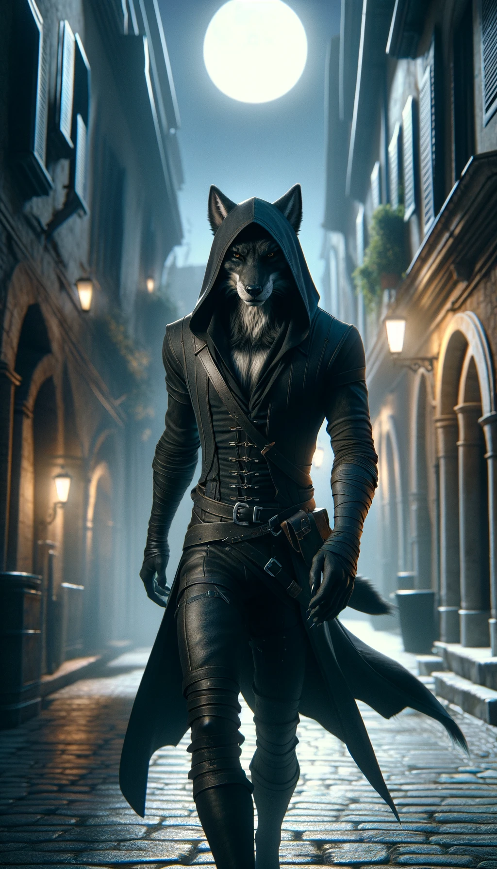 - Appearance: Rhaegar is tall and lean, built for agility rather than brute force. His jet-black fur blends easily into the night, and his eyes, sharp and calculating, seem to scan every corner of his surroundings even in stillness. His leather gear is practical, dark-toned, and tailored for stealth, offering ease of movement without sacrificing protection.