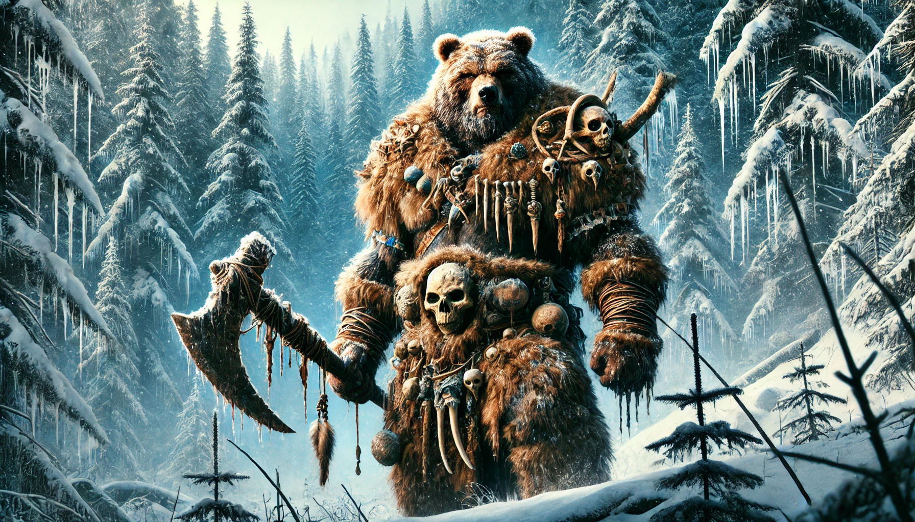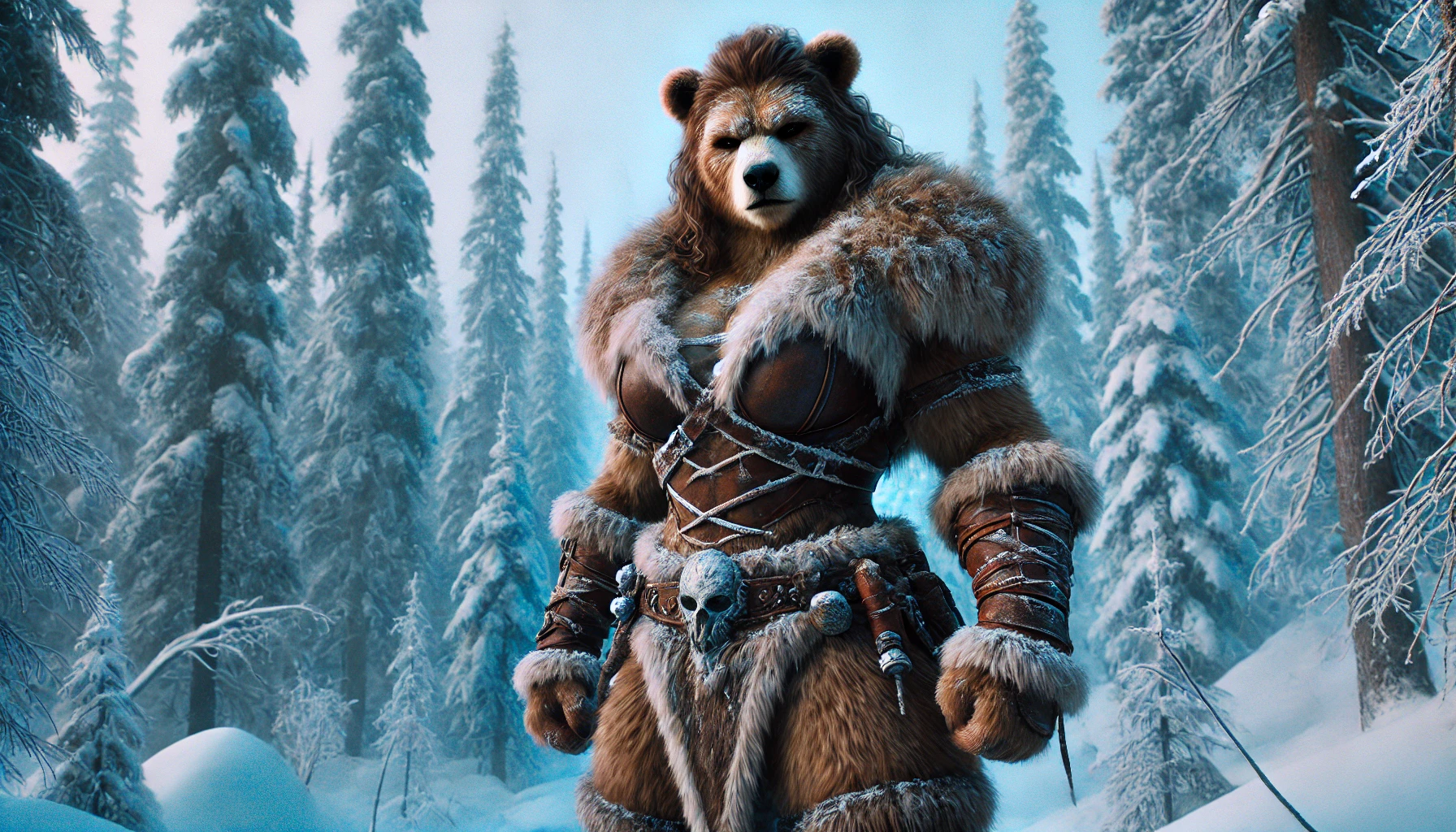 Amidst the stark, icy expanse of the Chorkas Forest, the Barbearians endure, a race of formidable humanoid bears carved from the relentless cold and isolation. Each Barbearian bears the weight of their ancestry, with fur as thick as the snow-laden pines and eyes that gleam with a fierce inner fire. Their bodies are massive and muscular, adaptations forged by both the harsh climate and their tumultuous history.