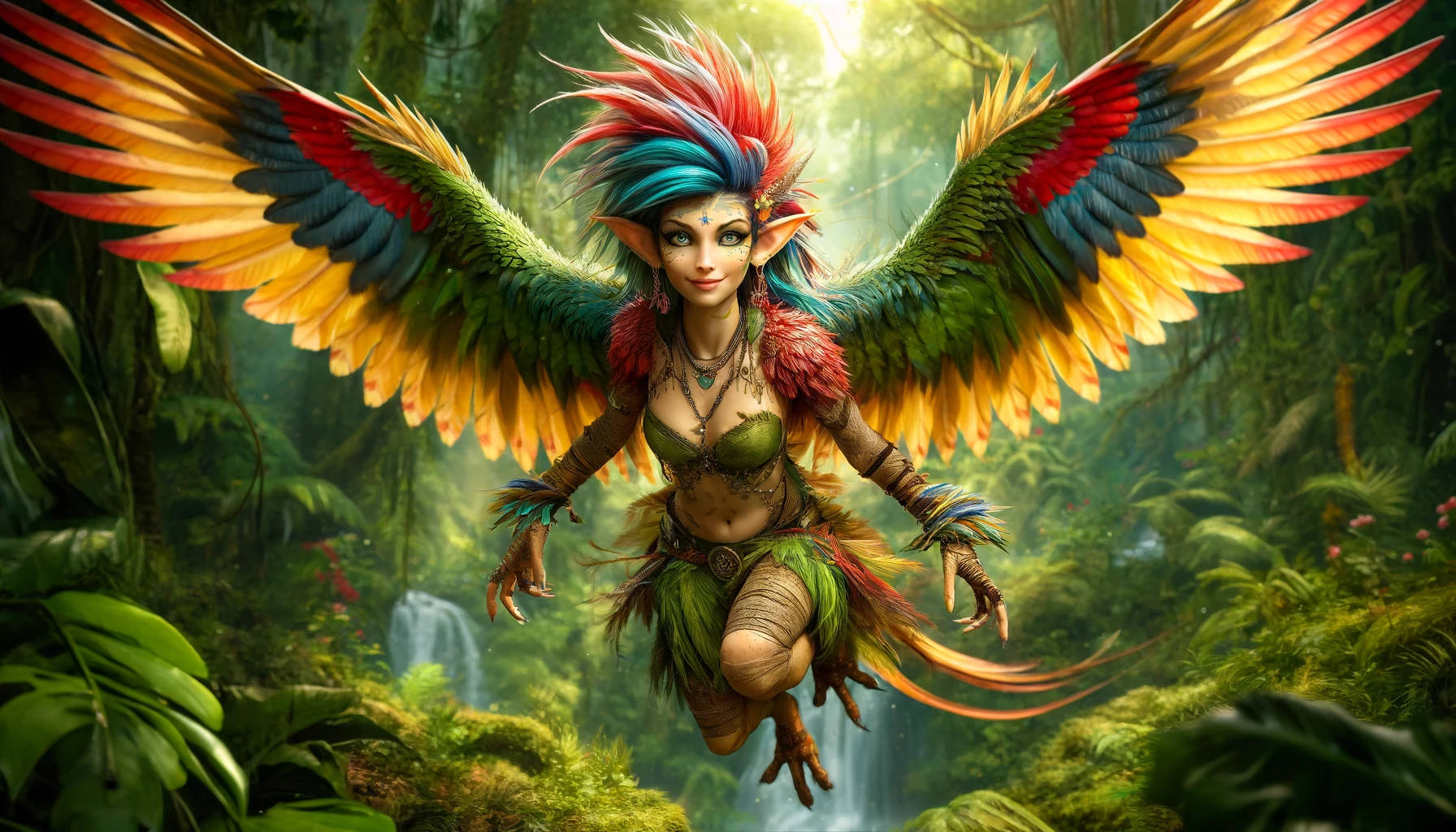 Description: The Agra Harpies, hailing from the forested island of Alblitus south of Siar Morrin, are renowned for their petite stature and vibrant plumage. Among all the harpy subraces, they are perhaps the most visually striking, their feathers displaying a kaleidoscope of colours that rival even the most resplendent of tropical birds.