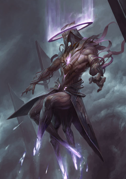 Alache in his traditional form is the embodiment of the unseen and the unknown, a deity cloaked entirely in shadows. His form is fluid and intangible, merging seamlessly with the darkness around him, making it difficult to discern where his outline begins or ends. The darkness that envelops Alache is not merely absence of light but a living, breathing presence that whispers secrets and watches the world with a quiet, all-knowing gaze. His eyes, when they choose to reveal themselves, shine like cold stars against the pitch black of his form, piercing through the shadows to observe the realm of mortals. His head is adorned with a dark elongated helmet, more a silhouette than a solid object. Encircling this helmet is a dark halo, reminiscent of an eclipse, that emits a dark light of its own.