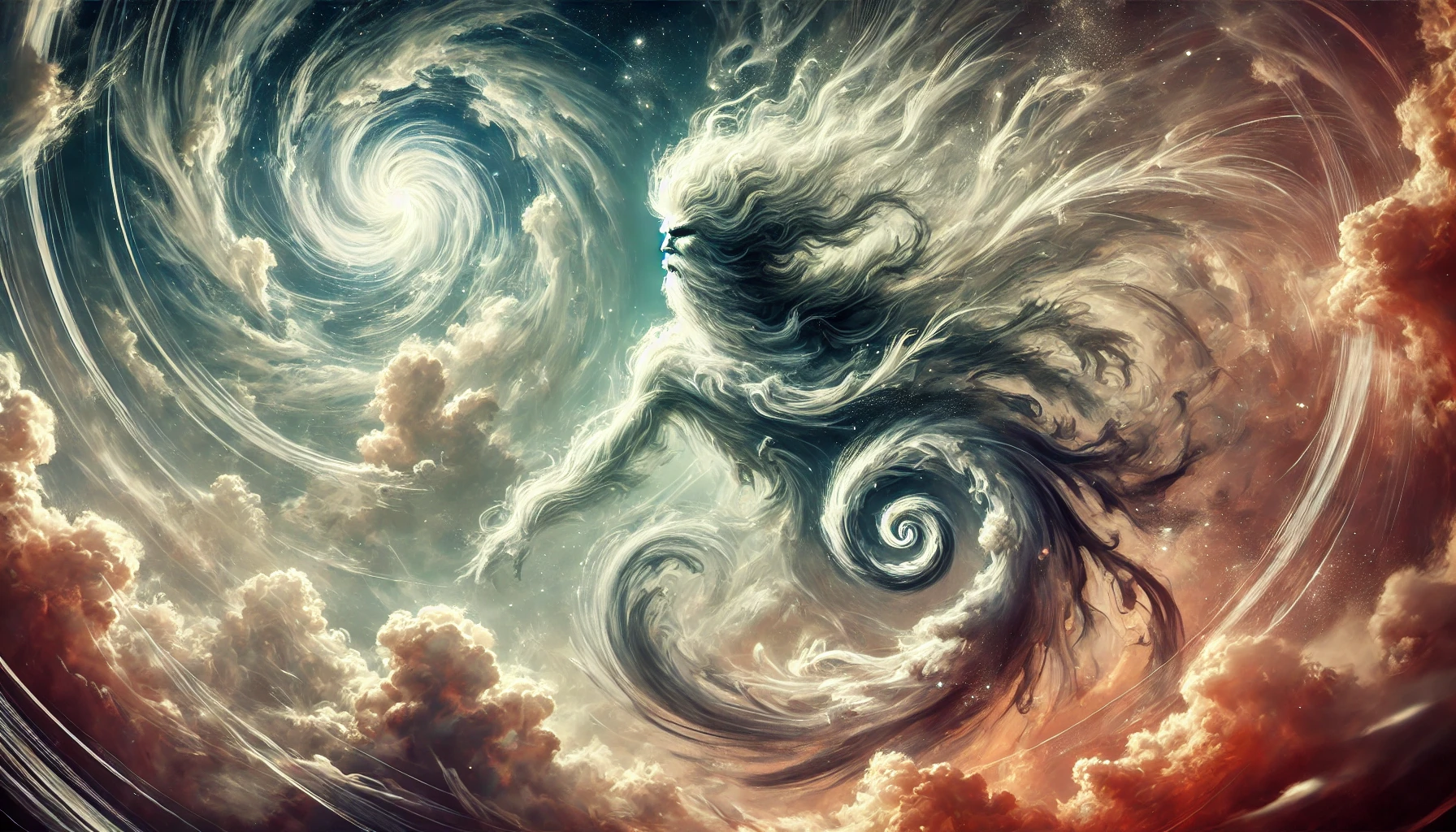 When choosing to interact more directly with other deities or mortals, Gaoth Oir can condense his vast essence into a more recognizable humanoid shape. In this form, he appears as a tall, slender figure composed of swirling mists and vapors. His body is translucent and shimmering, with a core of swirling clouds that shift continuously, reflecting the ever-changing nature of the wind. His features are elegant and fluid, never fully solid but defined enough to convey expressions and emotions. His eyes, clear as the sky on a calm day, hold a depth that seems to see right through the physical forms to the essence beneath.