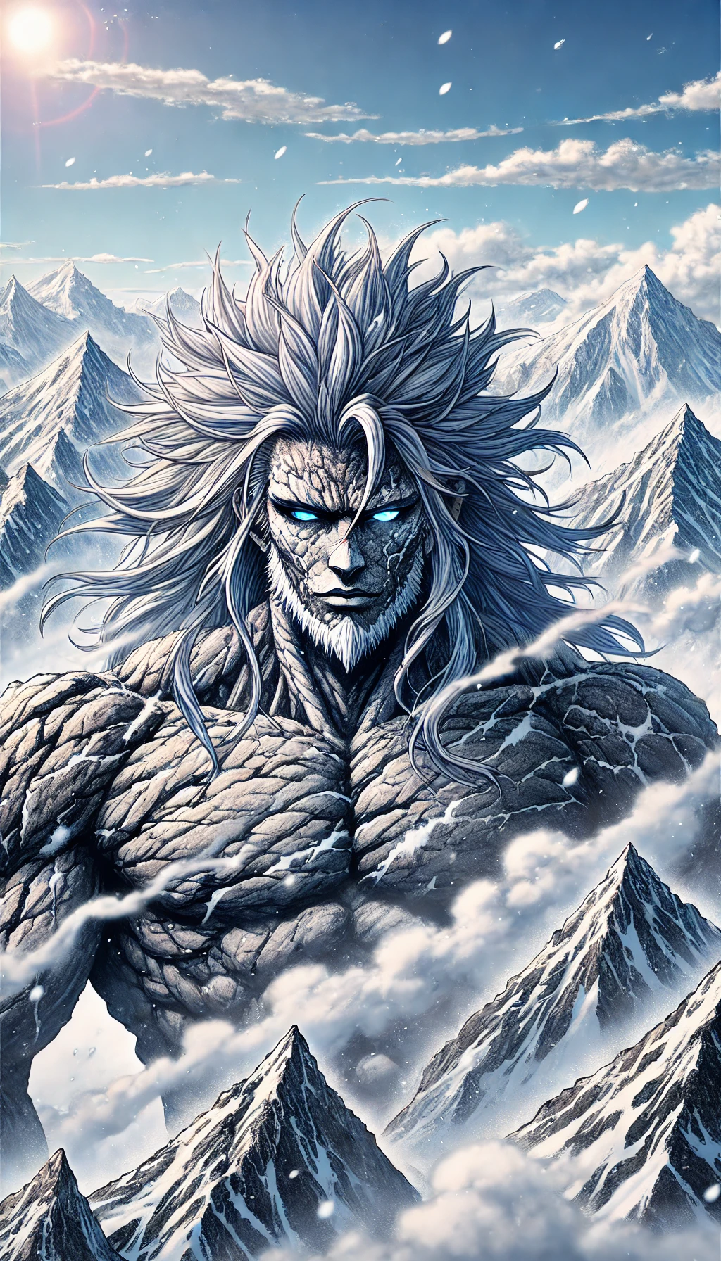 Kair’s hair is a wild, flowing mane of snow and ice, ever-shifting and shimmering with a life of its own. It cascades around his shoulders like an avalanche, sparkling with frozen droplets that catch the light with every movement. Surrounding him, a perpetual mist and thin clouds form a cloak that billows and swirls, mimicking the mountain winds that sweep through rocky passes and over sharp ridges.