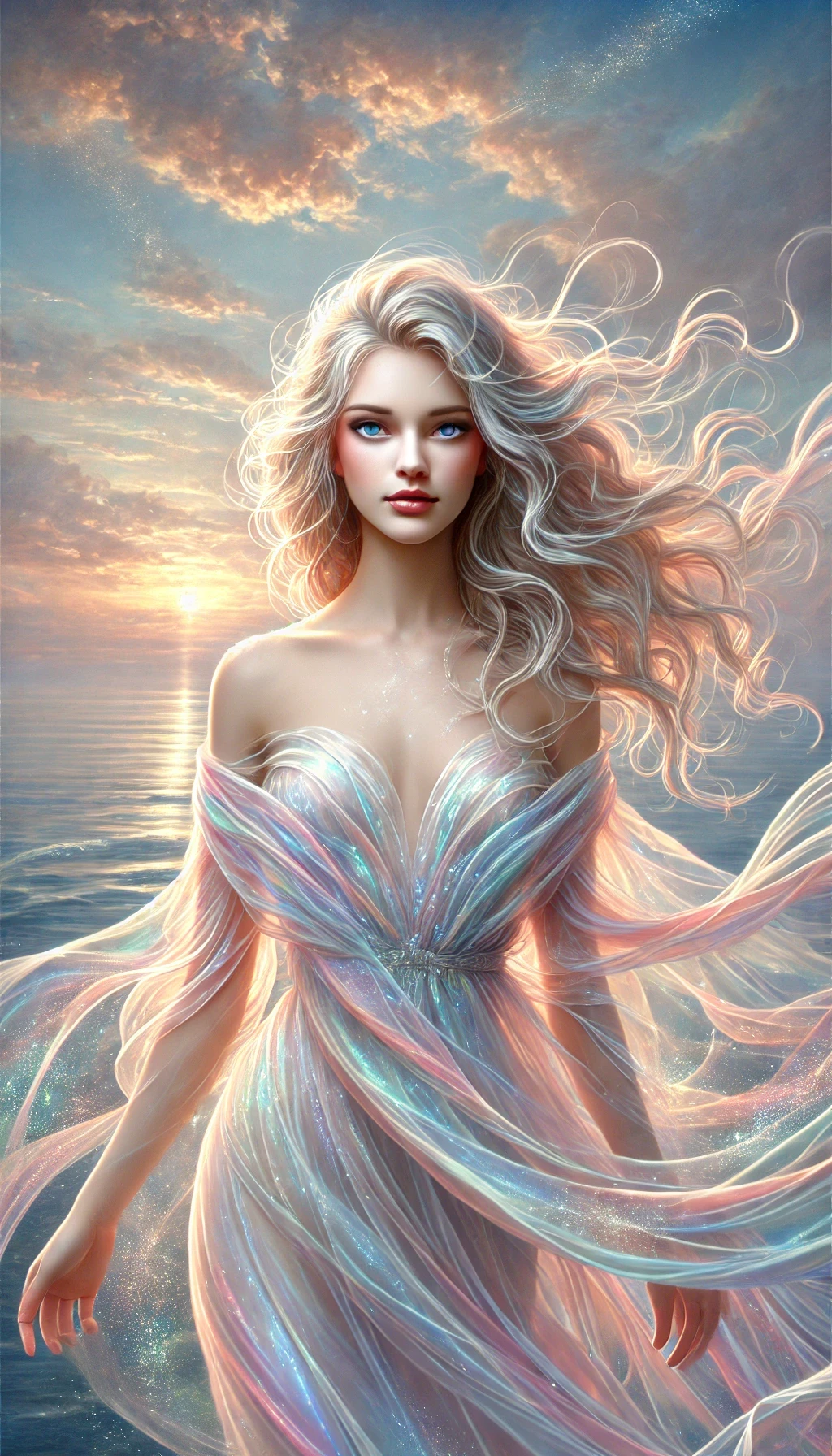 Her attire is made of fabrics that appear weightless, flowing around her in soft waves and billows with every movement, as if perpetually caught in a mild, uplifting wind. These garments shimmer with the pale colors of dawn—soft blues, gentle lavenders, and warm pinks, suggesting the sky at sunrise or sunset. The fabric moves with a fluid grace, perfectly capturing the essence of a favorable breeze that fills the sails of ships and carries them to distant shores.