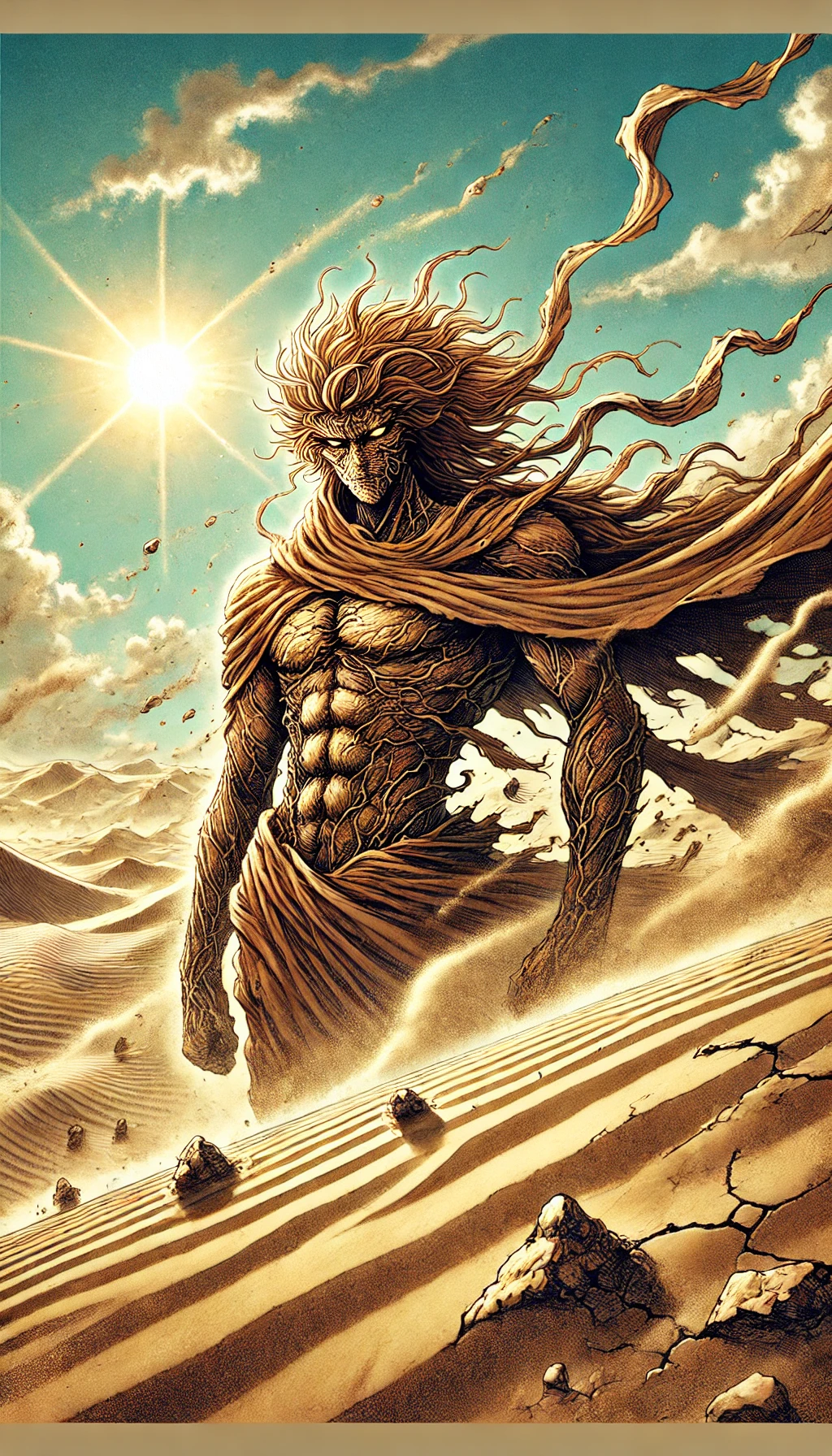 - Distinguishing Features: His most notable features are his sandy textured skin, sunlit yellow eyes, and his hair made of swirling sand and dust.
