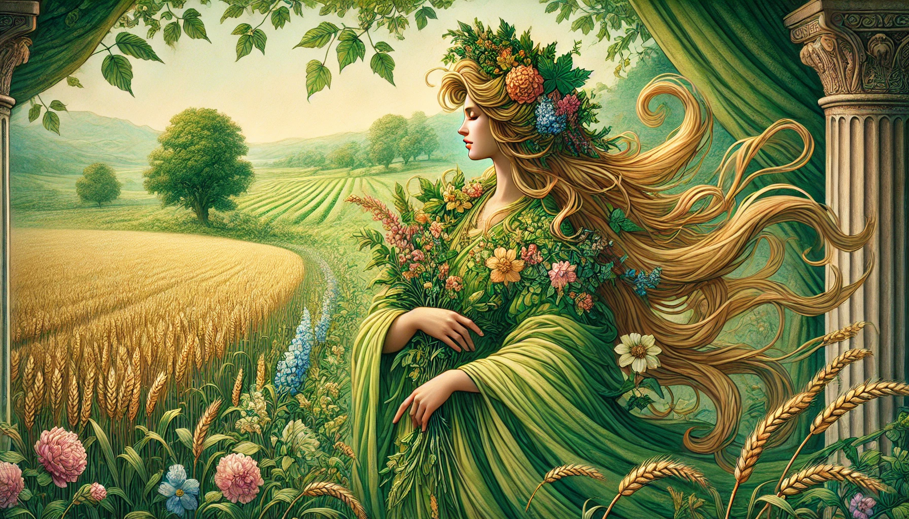 Her hair, a luxurious cascade of golden locks, flows around her like a river of grain. Each strand shimmers with the vitality of well-tended fields swaying in the breeze. Her hair is interwoven with an array of flowers, a living crown that not only enhances her beauty but also serves as a symbol of her divine position.