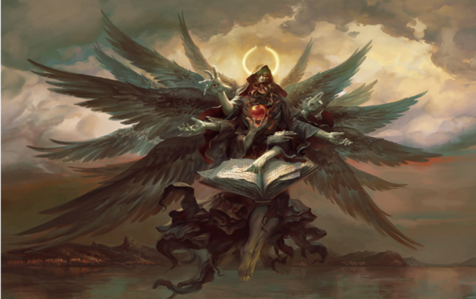Once Eolas was depicted as an enigmatic figure shrouded in a cloak of many colors, representing the vast spectrum of knowledge she oversees. Her eyes, bright and penetrating, are said to see into the very soul, uncovering truths that lie hidden. Now her form is dynamic and multi-armed, symbolizing her grasp on vast and varied knowledge. She has multiple wings, each feather inscribed with runes and symbols of ancient lore. Her face is partially obscured by a hood, but her eyes shine with an intense, knowing light.