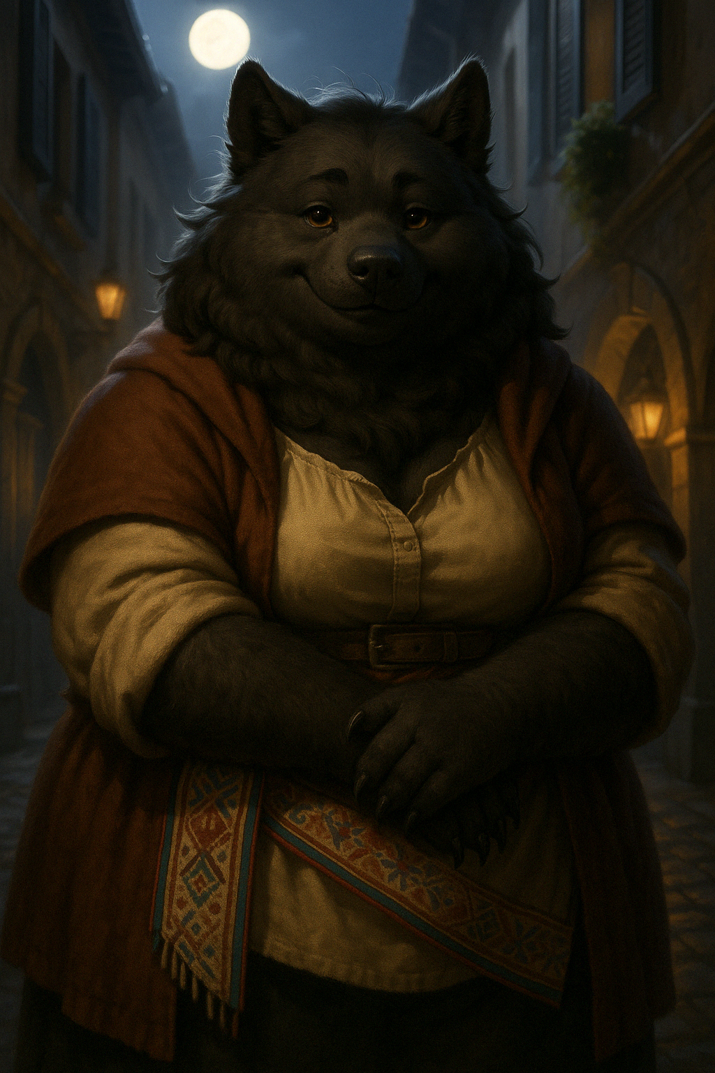 - Appearance: Lioren shares the family’s trademark black fur and large build, but unlike her battle-hardened siblings, she carries herself with a laid-back, almost leisurely grace. Her frame is bulky, more soft than sculpted, though she often refers to this as simply being “fluffy.” Her clothes tend to be looser and more decorative than practical, often adorned with handmade trinkets or splashy fabrics she finds charming. A persistent glint of amusement rests in her amber eyes, as if always in on a joke no one else has quite figured out.