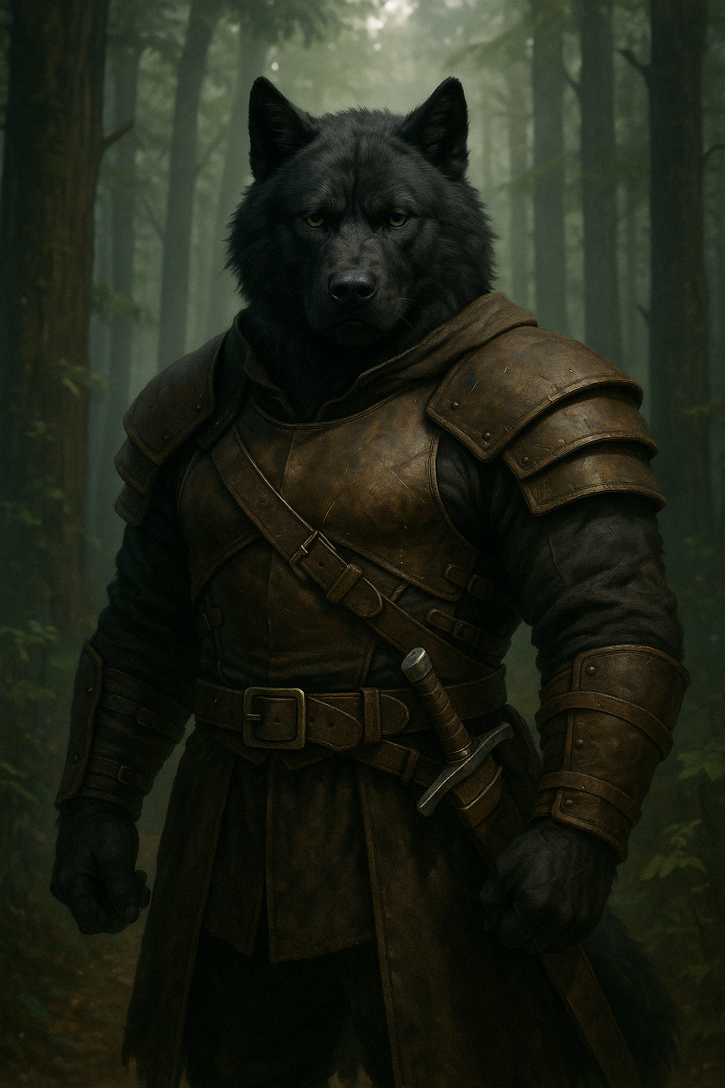 - Appearance: Vaerun is an imposing figure, broad of shoulder and thick with muscle, his presence casting a long shadow even in the twilight of the forest. His fur is a mottled charcoal with flecks of dark grey across his limbs, while a trio of faded scars slash across his left cheek—silent warnings from past confrontations. His armor is functional and weather-worn, a patchwork of treated leather and iron accents that tell of decades defending the pack’s borders.