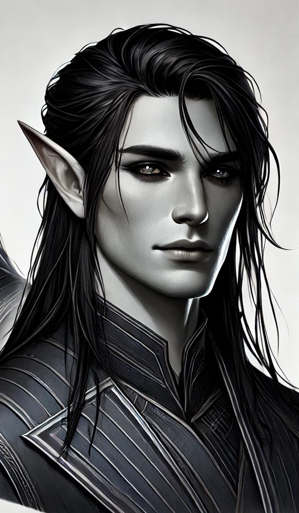 - Appearance: Darius possesses the ethereal, graceful appearance typical of his kind, with sharp, angular features and piercing dark eyes that seem to absorb light. His hair is long and black, often tied back to keep it out of his face during his duties. He wears utilitarian, dark clothing that helps him blend into the shadows of Ridgeback Forest.