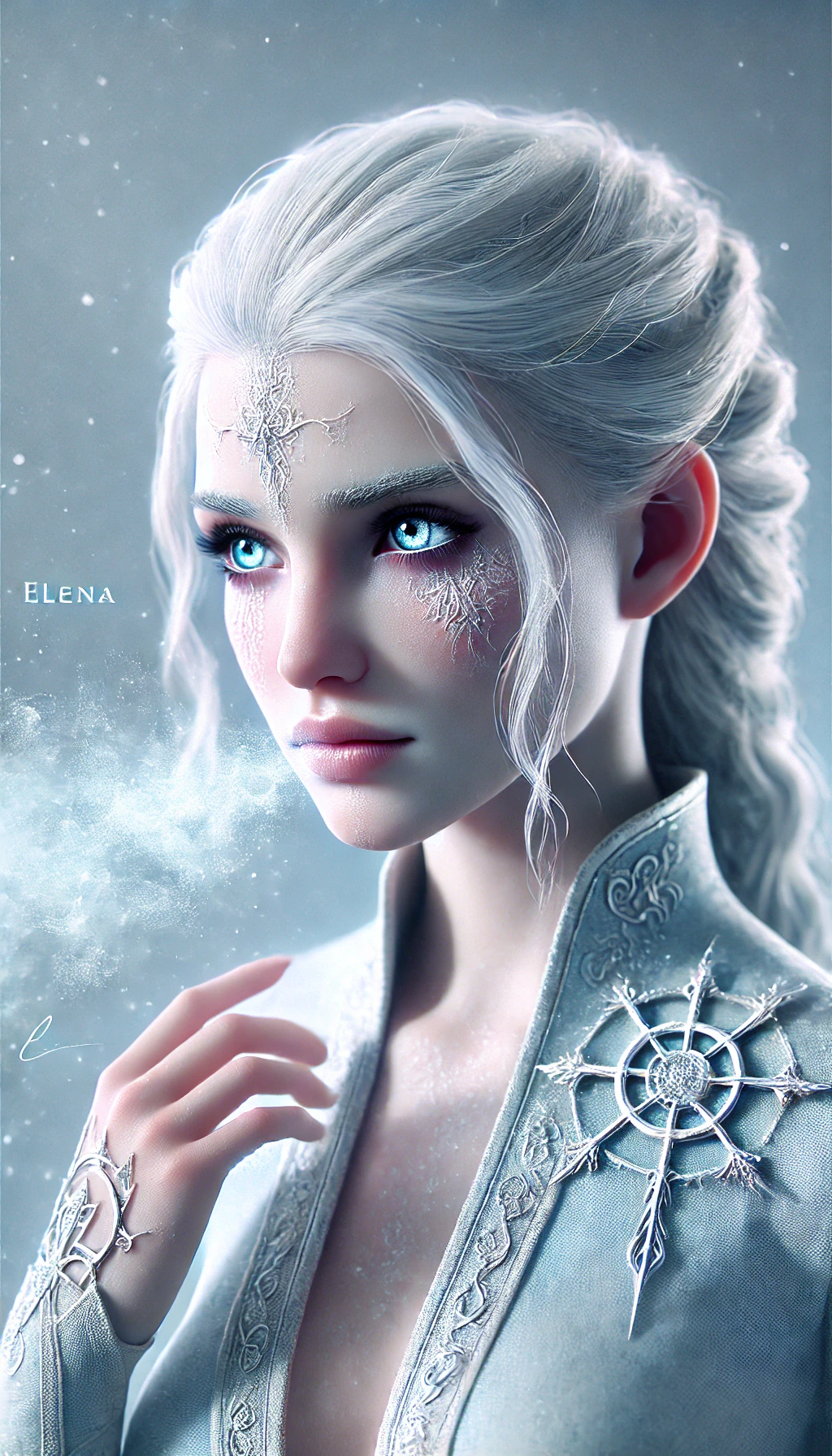 - Appearance: Elena has a striking appearance, with pale skin and silver-white hair that seems almost luminous. Her eyes, a clear icy blue, reflect her mastery over ice magic. She typically wears light robes that shimmer like frost, adorned with symbols of her craft.