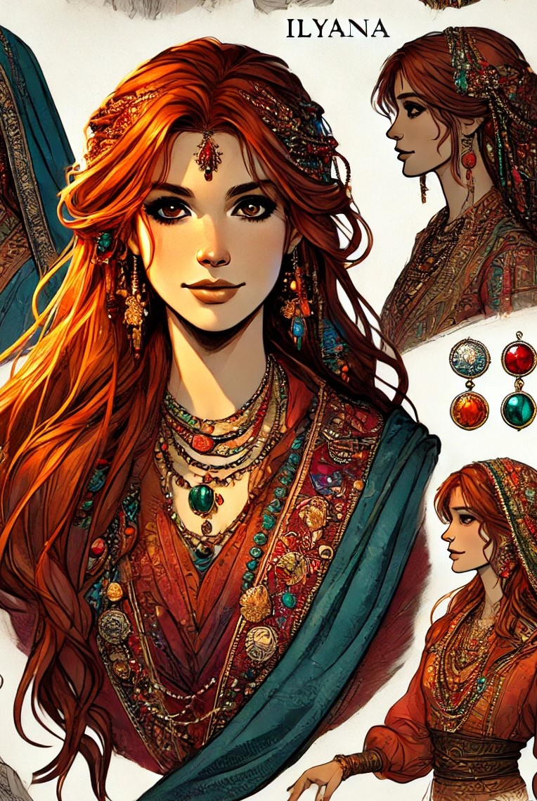 - Appearance: Ilyana is a vibrant and charismatic figure, often seen in elaborate, travel-friendly attire that showcases fabrics and styles from various regions of Siar’Morrin. She has long, flowing auburn hair and sharp, observant eyes that miss no details. Her attire is as much a tool of her trade as it is a statement of her personal style, often adorned with jewels and trinkets from her travels.