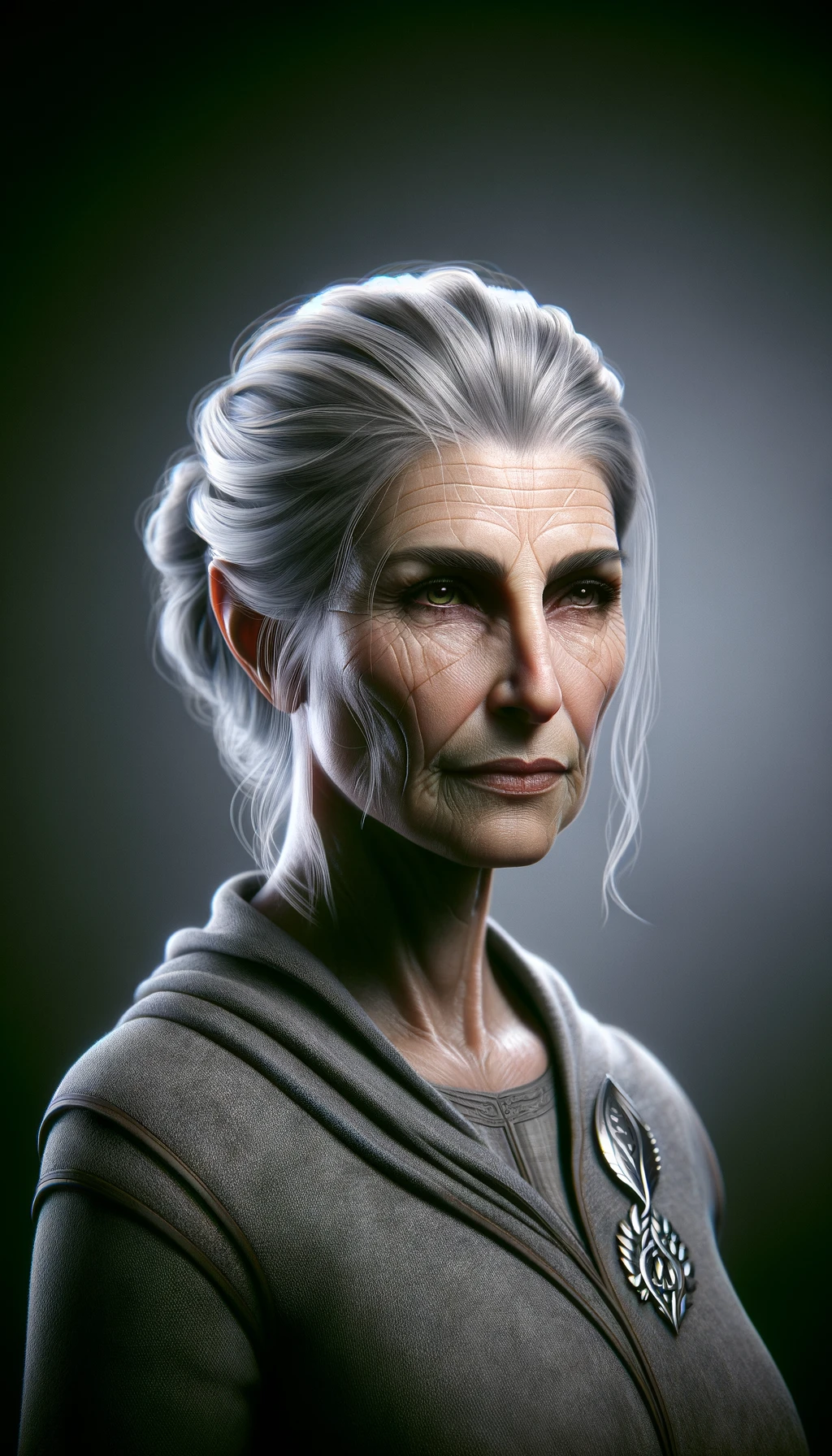 - Distinguishing Features: Signs of aging gracefully etched into her features, along with a silver brooch shaped like a leaf, gifted to her from an old elven friend from Silverleaf.