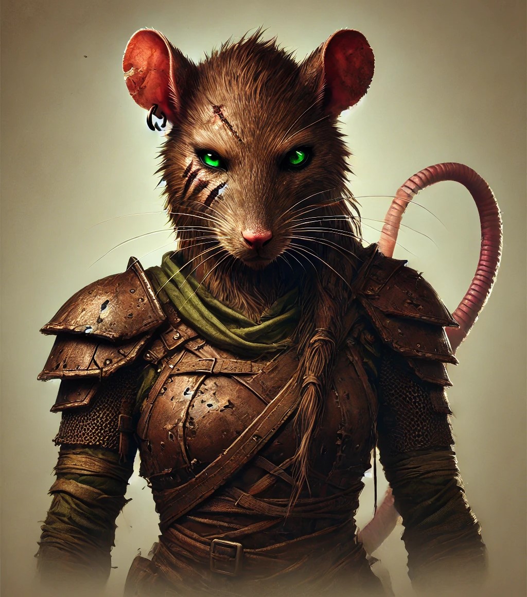 - Appearance: Zinna is robust and muscular, standing taller and broader than most Ratfolk. Her fur is a deep brown mottled with darker patches, and her intense green eyes scan her surroundings with an alertness born of constant vigilance. She typically wears armor crafted from the durable materials of the swamp, designed to provide maximum protection and mobility.