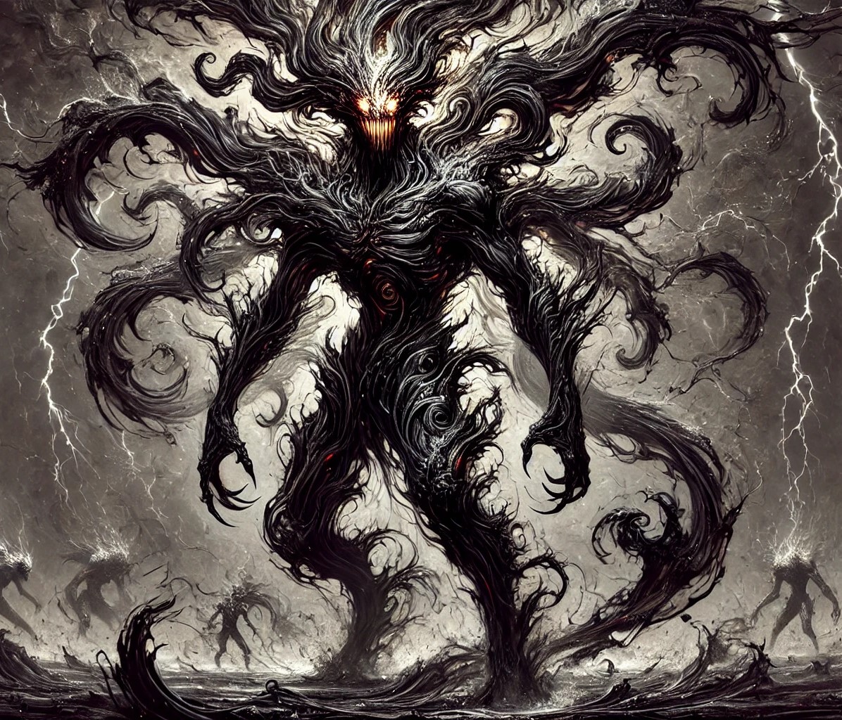 - Appearance: Aperkepsi has been depicted as a maelstrom of swirling dark vapors and jagged, lightning-like edges that seem to crackle with impulsive energy. His form continuously shifts, with limbs elongating or retracting unpredictably, eyes if they can be called that, flicker like wild flames across his visage, never resting in one place.