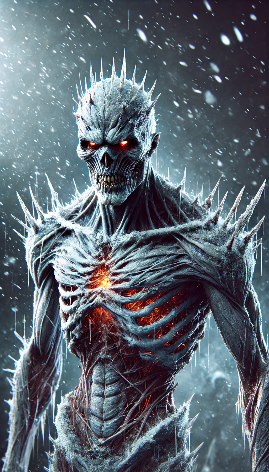 - Appearance: Pesmin is depicted as a gaunt, twisted figure, his skin like that of a frozen cadaver with icicle jutting through the skin haphazardly over its body. His eyes burn with a cold, malevolent fire, set deep within a skull-like face with sharp, protruding cheekbones and a permanently twisted sneer. His mouth is filled with jagged, broken teeth. His thin, claw-like fingers are elongated and end in sharp talons.