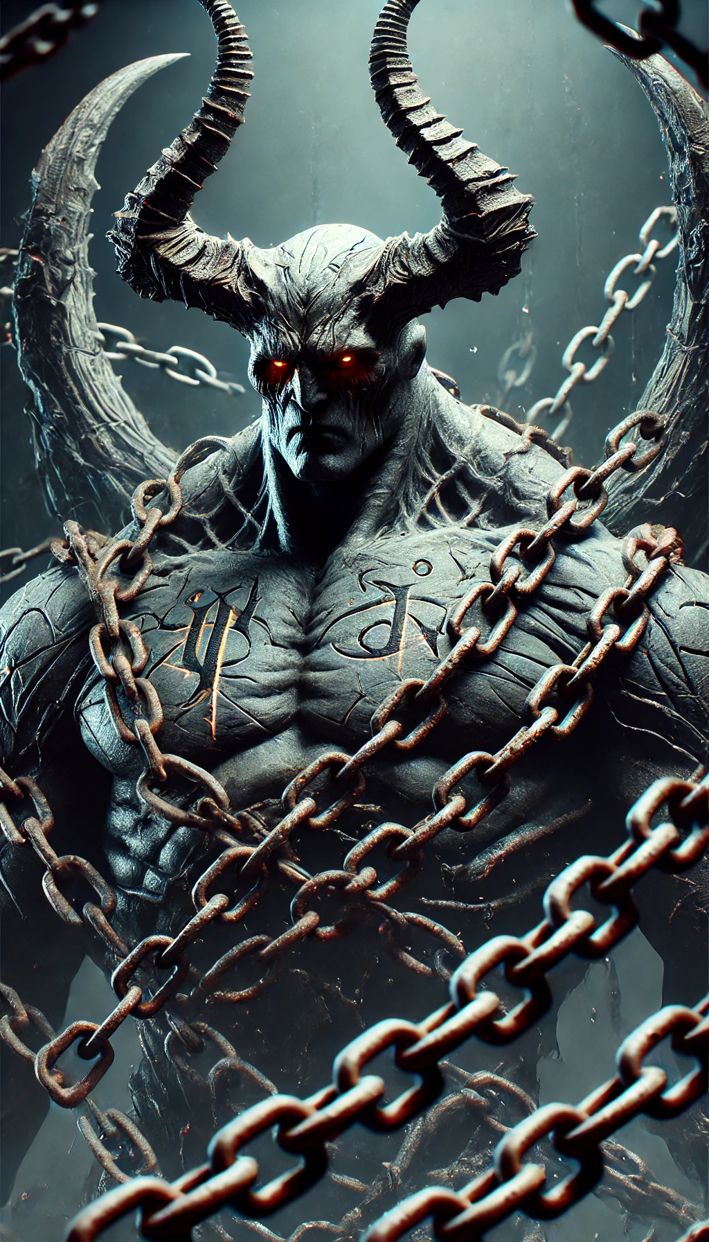 - Appearance: Chyntum is depicted as a powerful, demonic figure, his form wrapped in heavy, iron chains. His skin is a dark, ashen hue, marked with glowing runes of torment and regret. His muscular frame is hunched under the weight of his chains, giving him a perpetually burdened appearance.