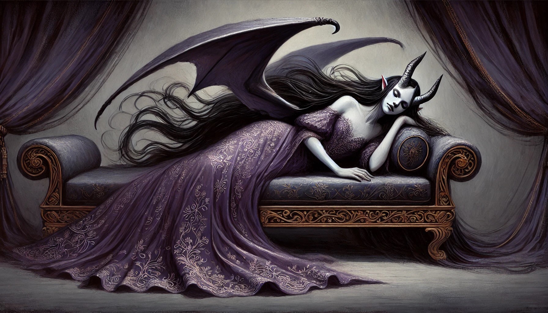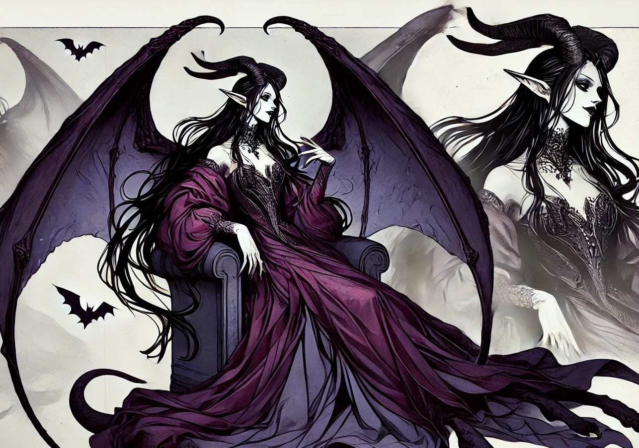 - Appearance: Pathupem is depicted as a devilish figure exuding a sense of lethargy and indifference. Her form is tall and regal, with an aura of effortless grace, but her movements are slow and languid. Her skin is a pale, and her eyes are perpetually half-closed. Her hair is long and flows like dark smoke, often appearing to move as if caught in a slow, underwater current. She wears elegant flowing robes of royal purple colour. Her wings are large and bat-like, but they often hang limply at her sides, barely moving.